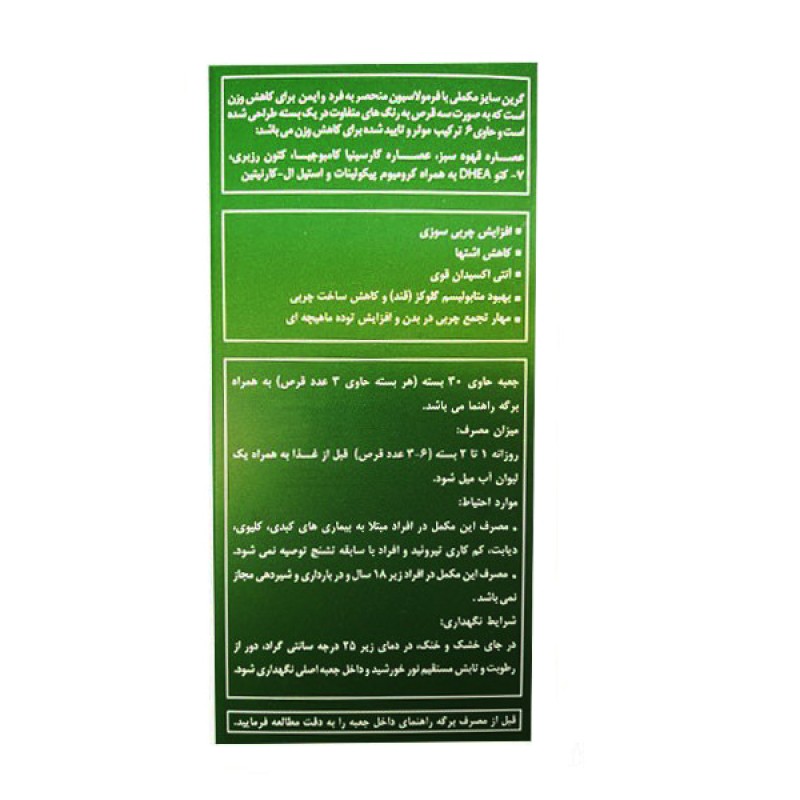 قرص سبز رنگ: عصاره گارسینیا کامبوجیا، استیل ال-کارنیتین و کتون رازبری (نوعی تمشک)