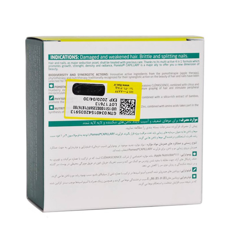 قرص پومئول کاپیلاری کلماساینس دارای فرمولاسیون اختصاصی 4 در 1 برای موها و ناخن ها است. موها و ناخن ها به عنوان سرمایه های زیبایی باید تحت مراقبت ویژه قرار گیرند. فرآورده پومئول کاپیلاری با توجه به فرمولاسیون 4 در 1 خود سبب رشد، قدرت، استحکام و درخشندگی موها و ناخن ها می گردد.مواد موثره جدید موجود در پوموتراپی (سیب درمانی)، فیتوتراپی و نوتریتراپی به جهت عملکرد همزمان بر روی زیبایی مو و ناخن، برای فرآورده پومئول کاپیلاری انتخاب شده اند.