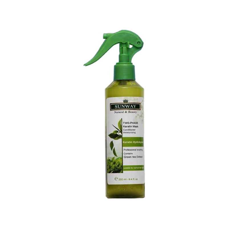 اسپری کراتینه دوفاز سان وی با وجود کراتین باعث ترمیم بافت مو آبرسانی به ساقه مو و جلوگیری از ایجاد موخوره می شود همچنین با وجود عصاره چای سبز باعث می شود مو ترمیم شده و شانه پذیری مو را افزایش می دهند و موهایی درخشان و نرم را به شما میدهد.