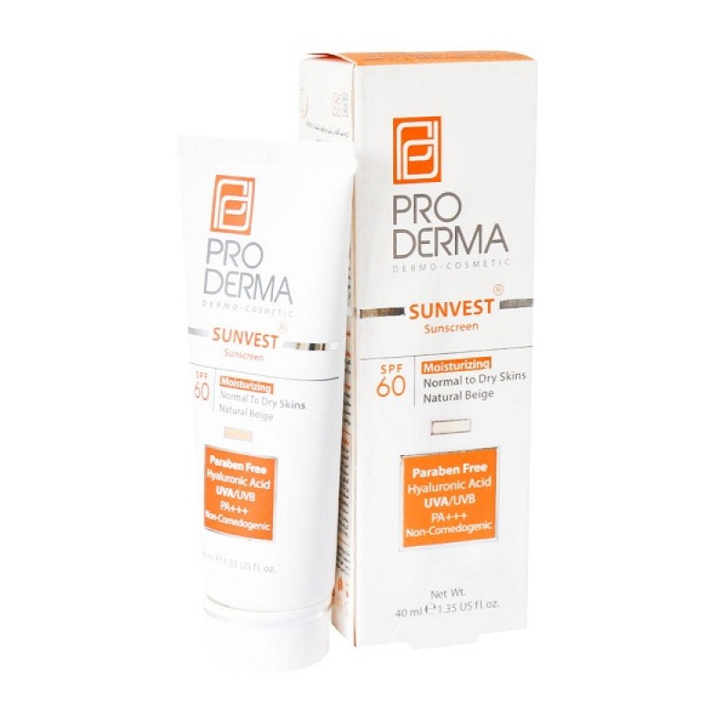 کرم ضد آفتاب و مرطوب کننده پرودرما SPF60 مناسب پوست های معمولی و خشک ۴۰ میلی لیتر Proderma Sunvest Sunscreen SPF60 Moisturizing Normal To Dry Skins 40 ml